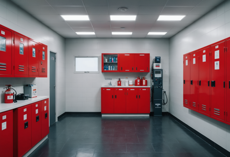 - Соответствие стандартам по размерам и вместимости для хранения комплектов противопожарных средств.